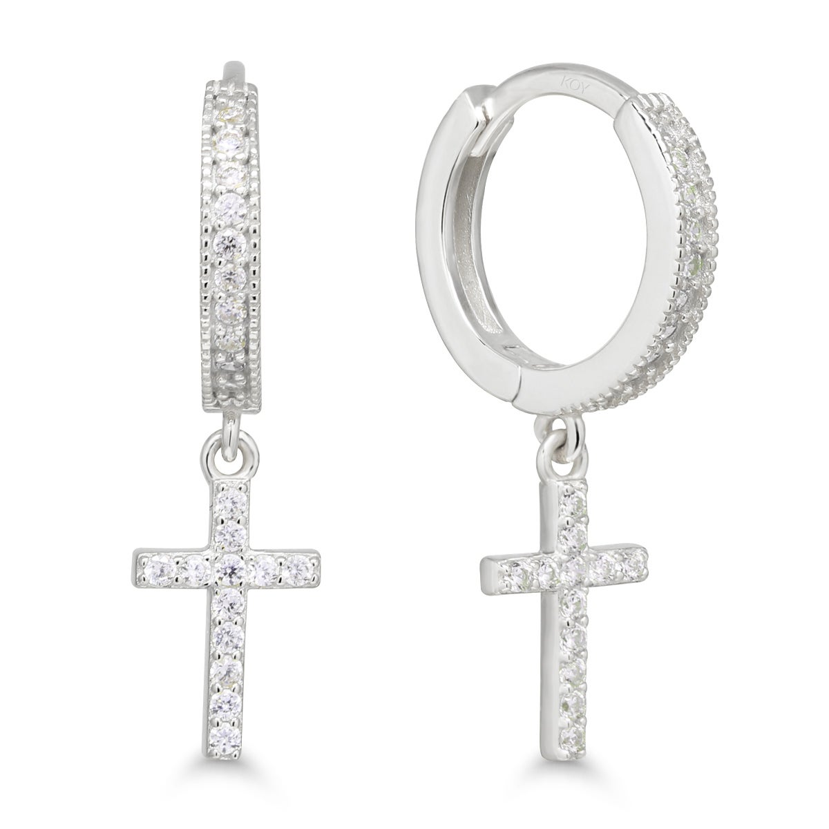 Hopeakorvarenkaat, joista roikkuvat kauniisti zirkoneilla koristellut ristit.